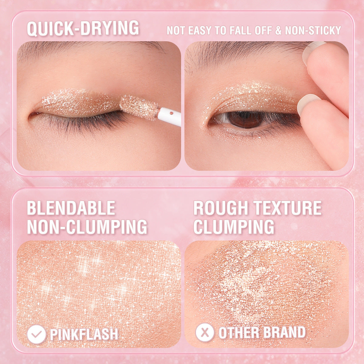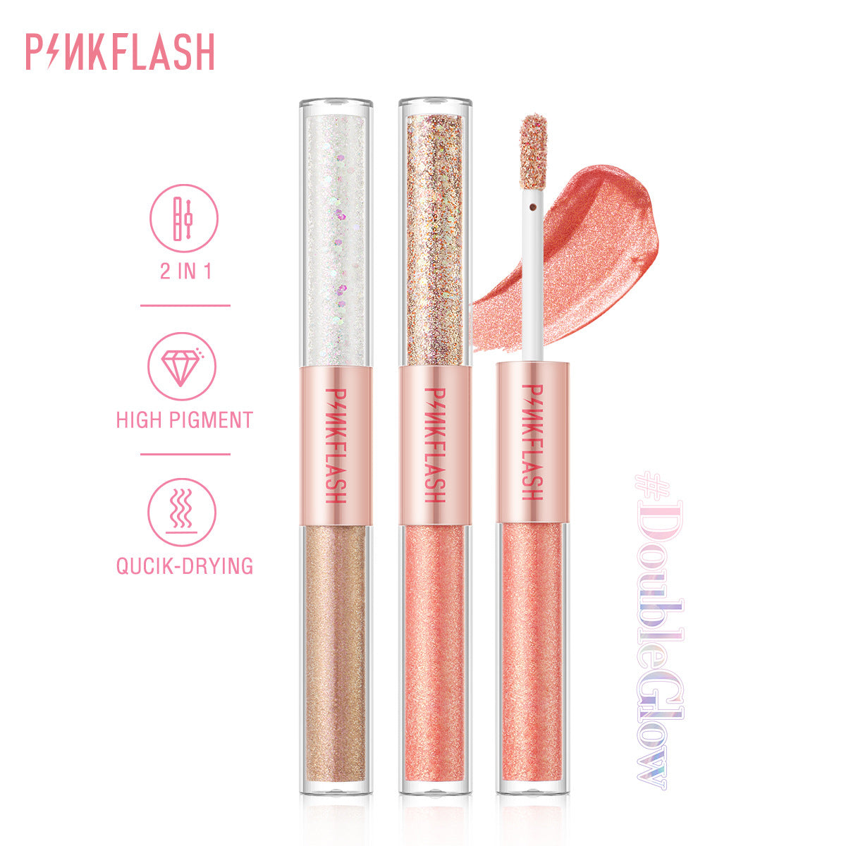 PINKFLASH Dual-Ended Liquid Eyeshadow features two complementary shades in one sleek wandâa shimmer and a matte or two sparkle finishesâfor quick, customizable eye looks. Its lightweight, crease-proof formula delivers intense color with a seamless blend.
